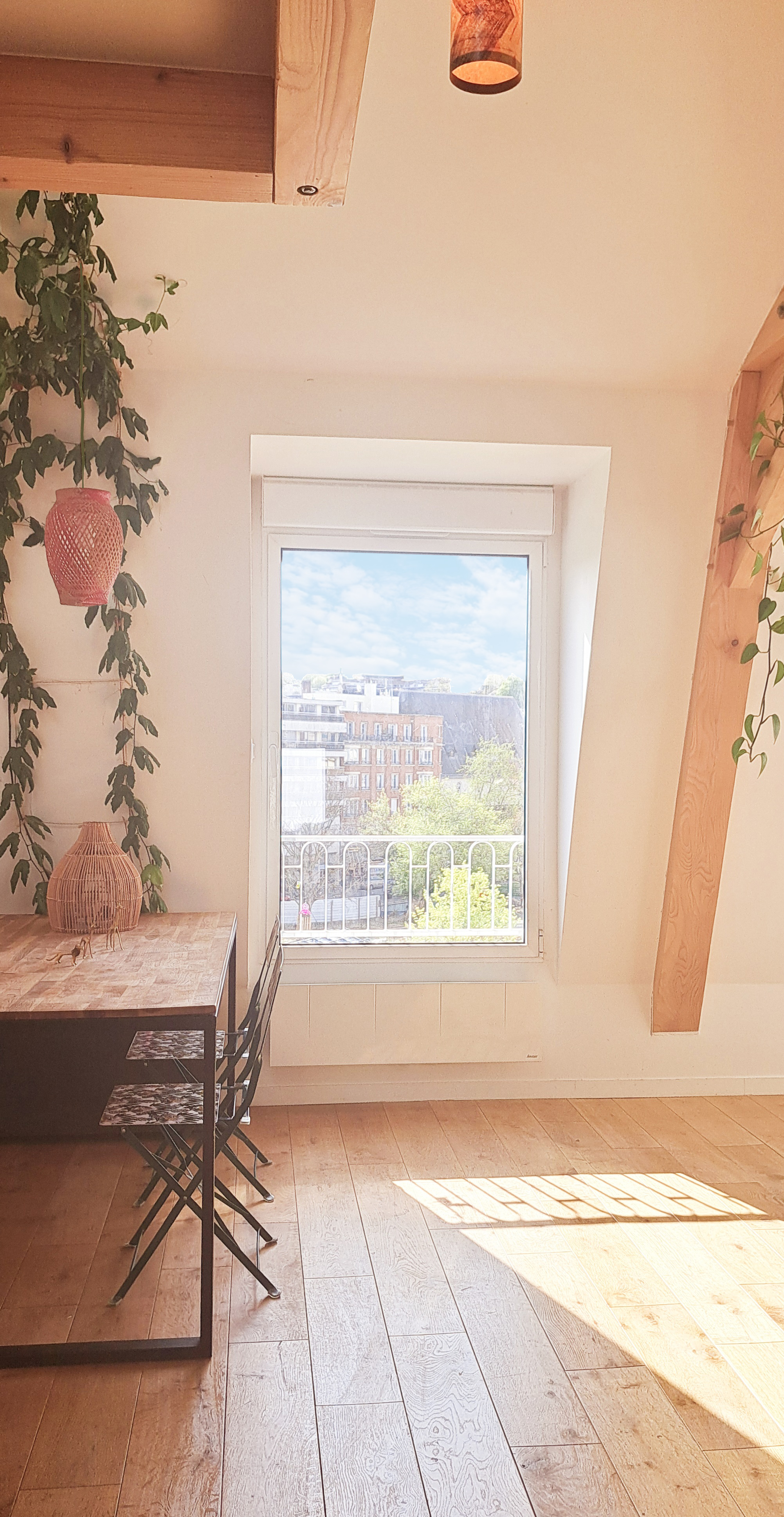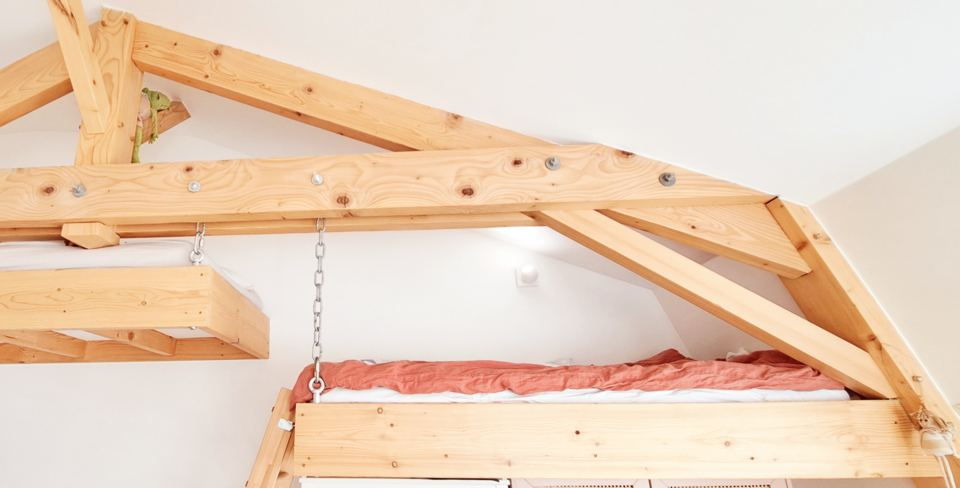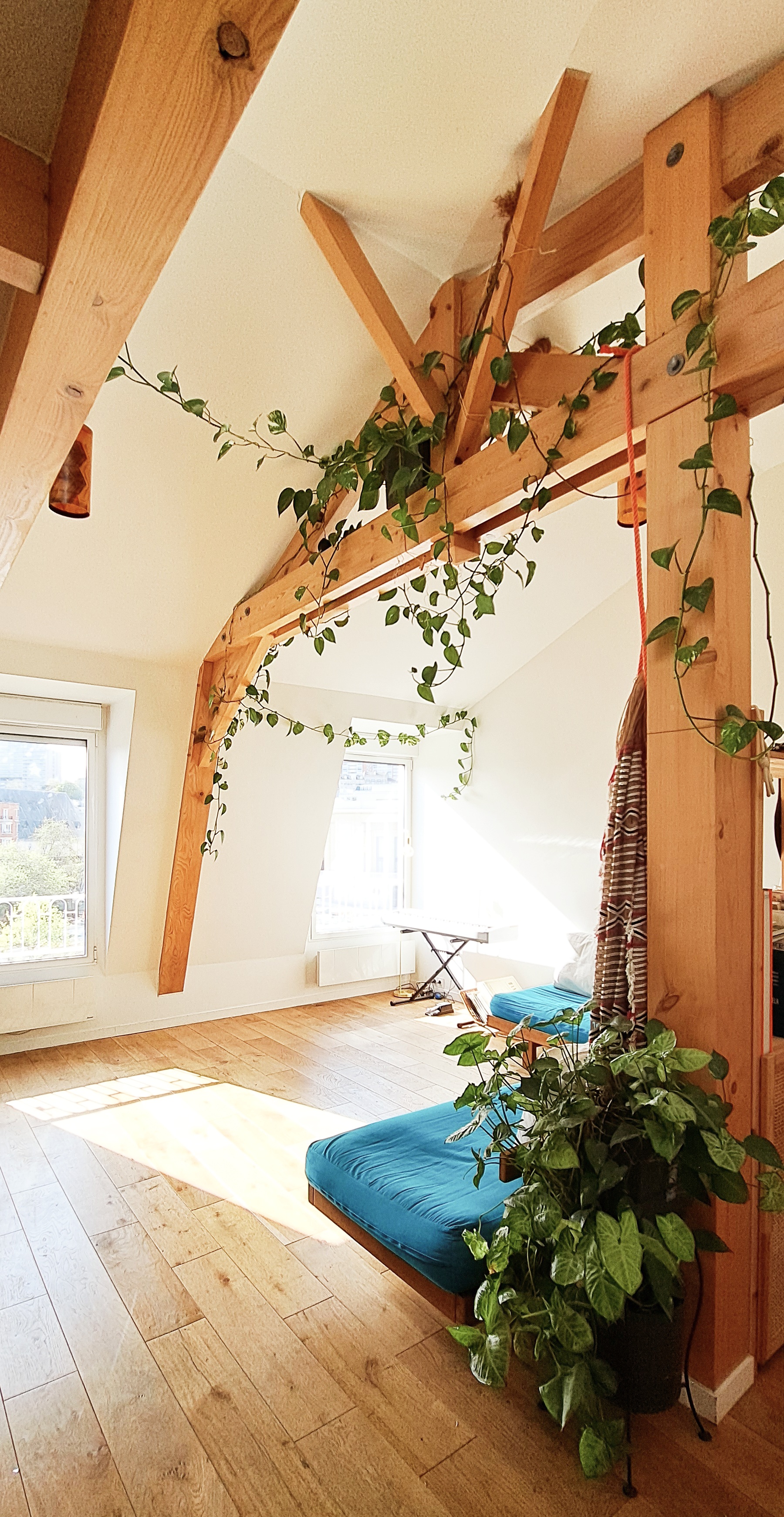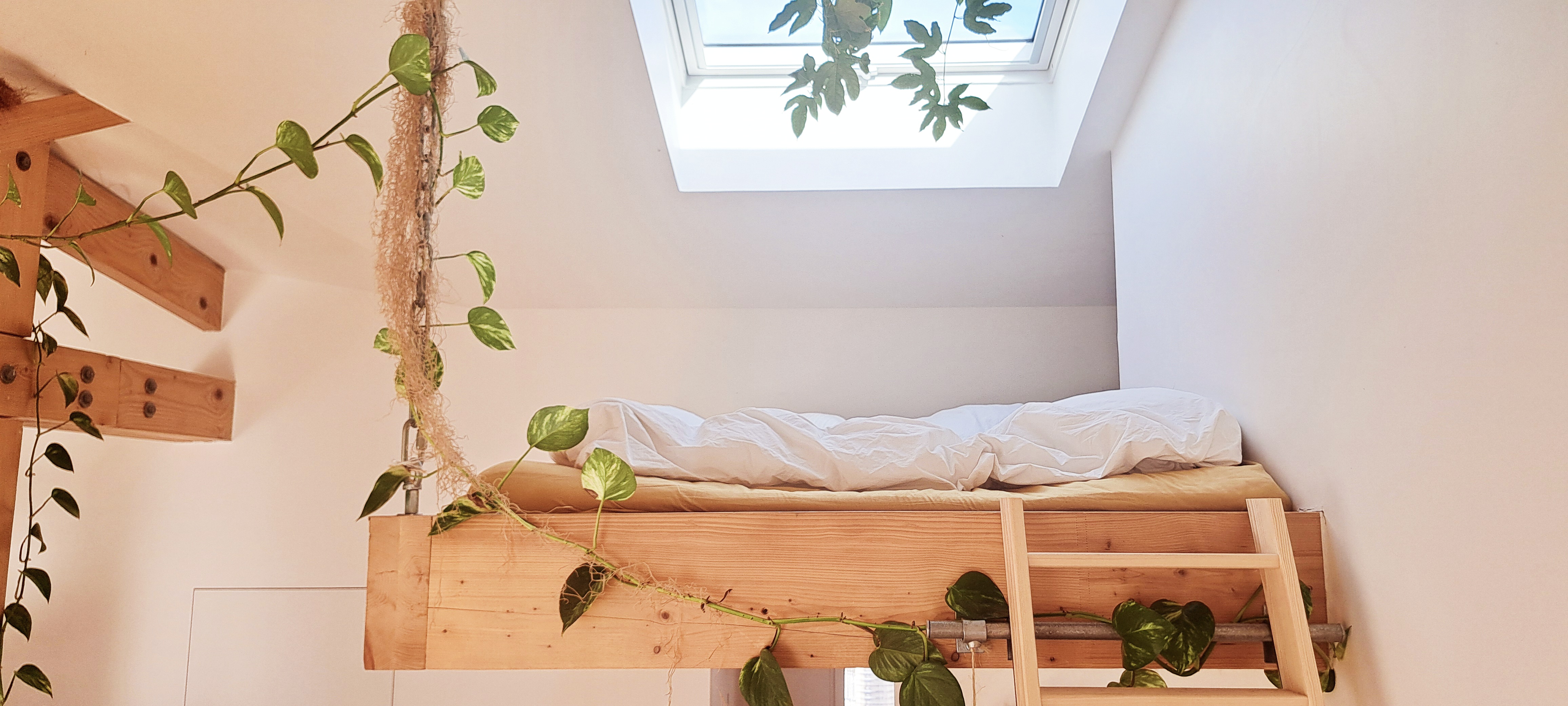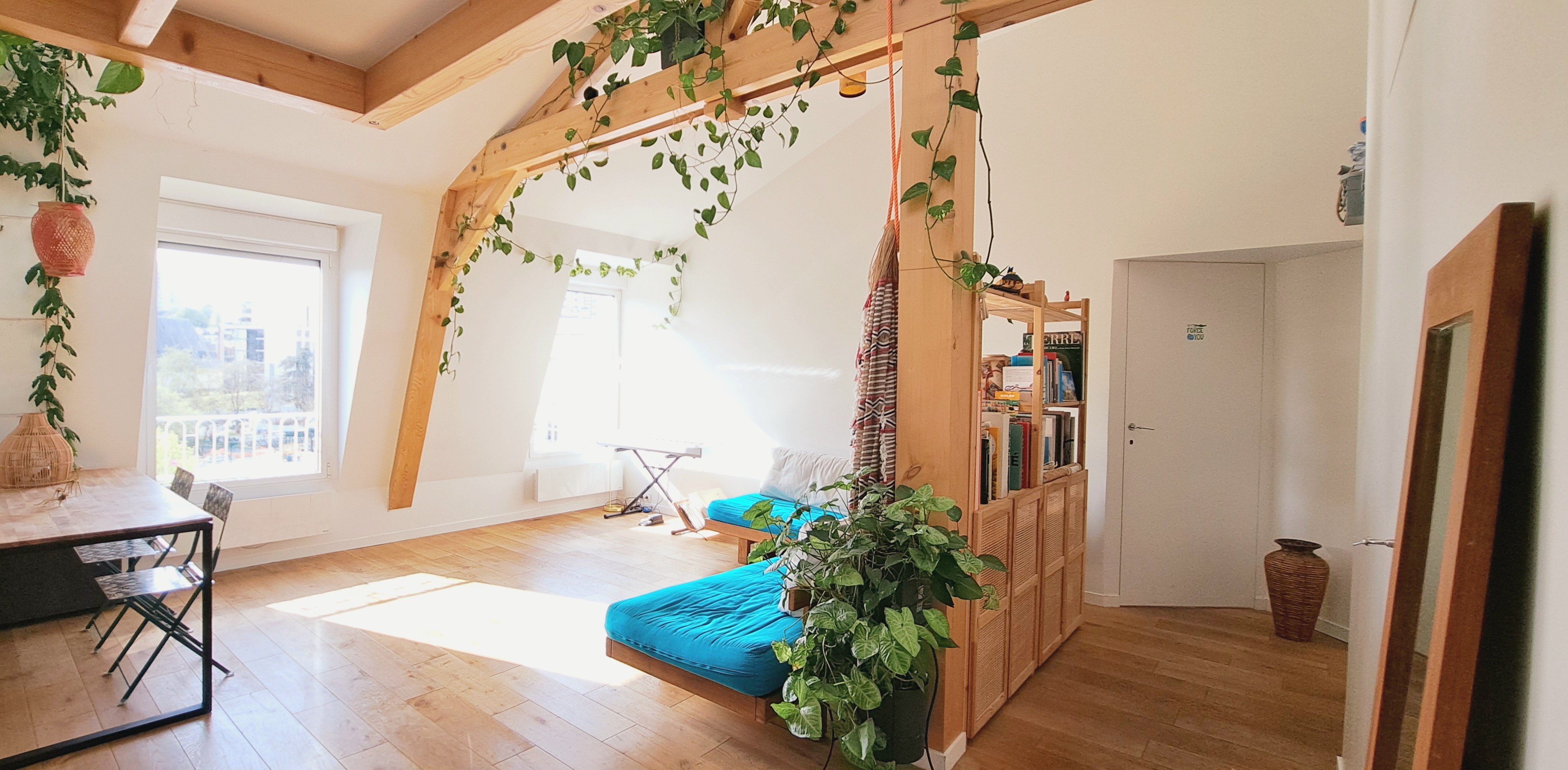 La structure bois et les combles mansardé ont permis une surélévation au poids acceptable pour cet immeuble qui totalise à présent cinq étages. Traversant, il est baigné de lumière. Avec sa belle hauteur sous plafond, on peut exploiter une partie du volume pour y installer les couchages dont les fermes sont la structure et ainsi libérer de la surface utile au sol. Les matériaux naturels sont valorisés. La présence du végétal apporte de l'apaisement. C'est un cocon qui surplombe la place de la mairie tout juste rénovée, au coeur de la ville. On s'y endort en regardant les étoiles par le velux.