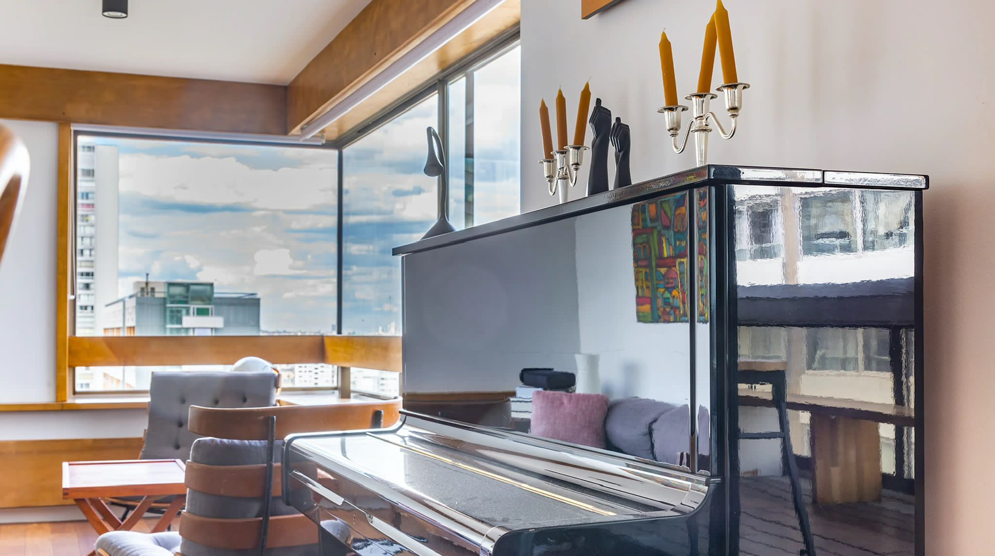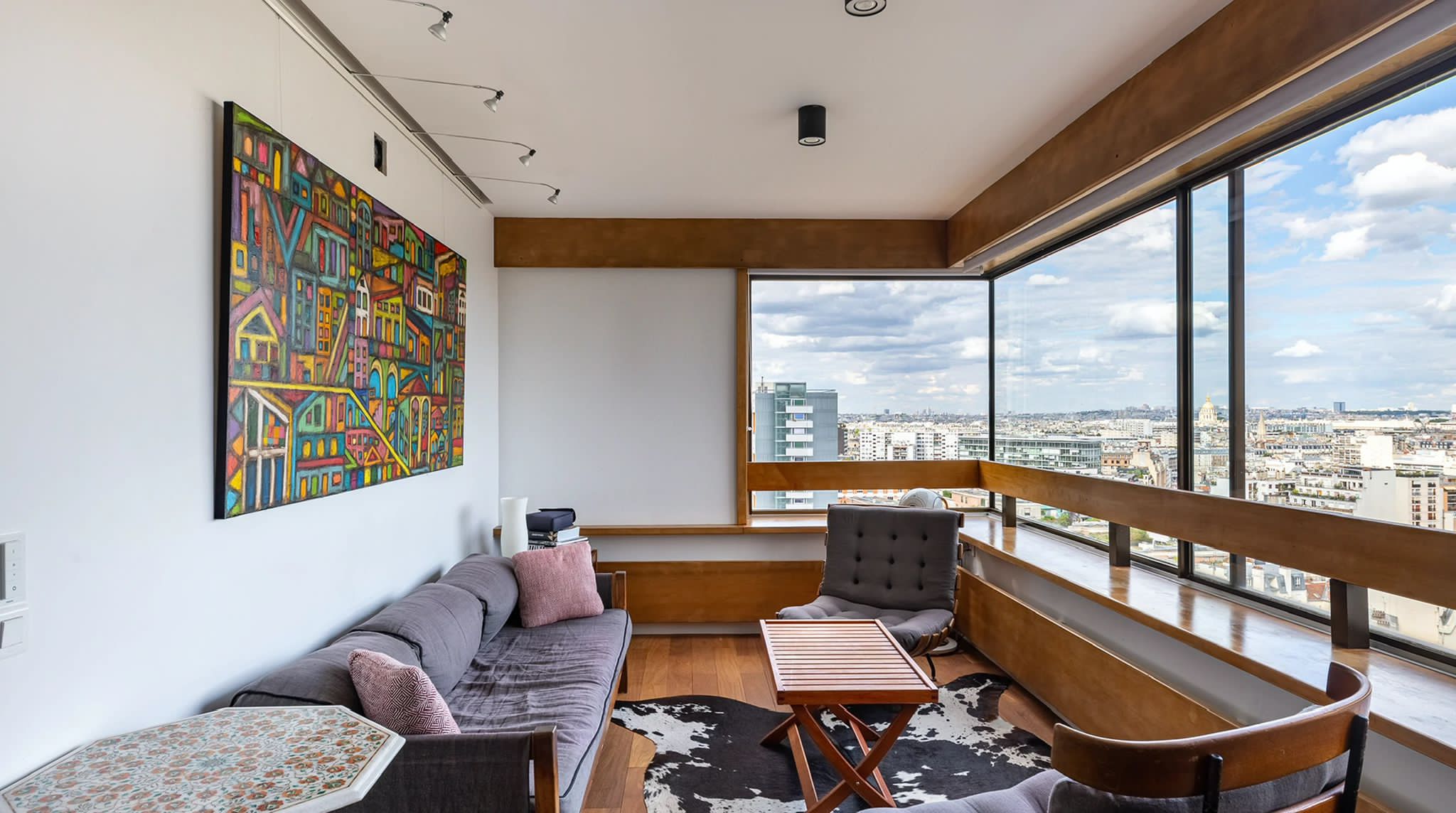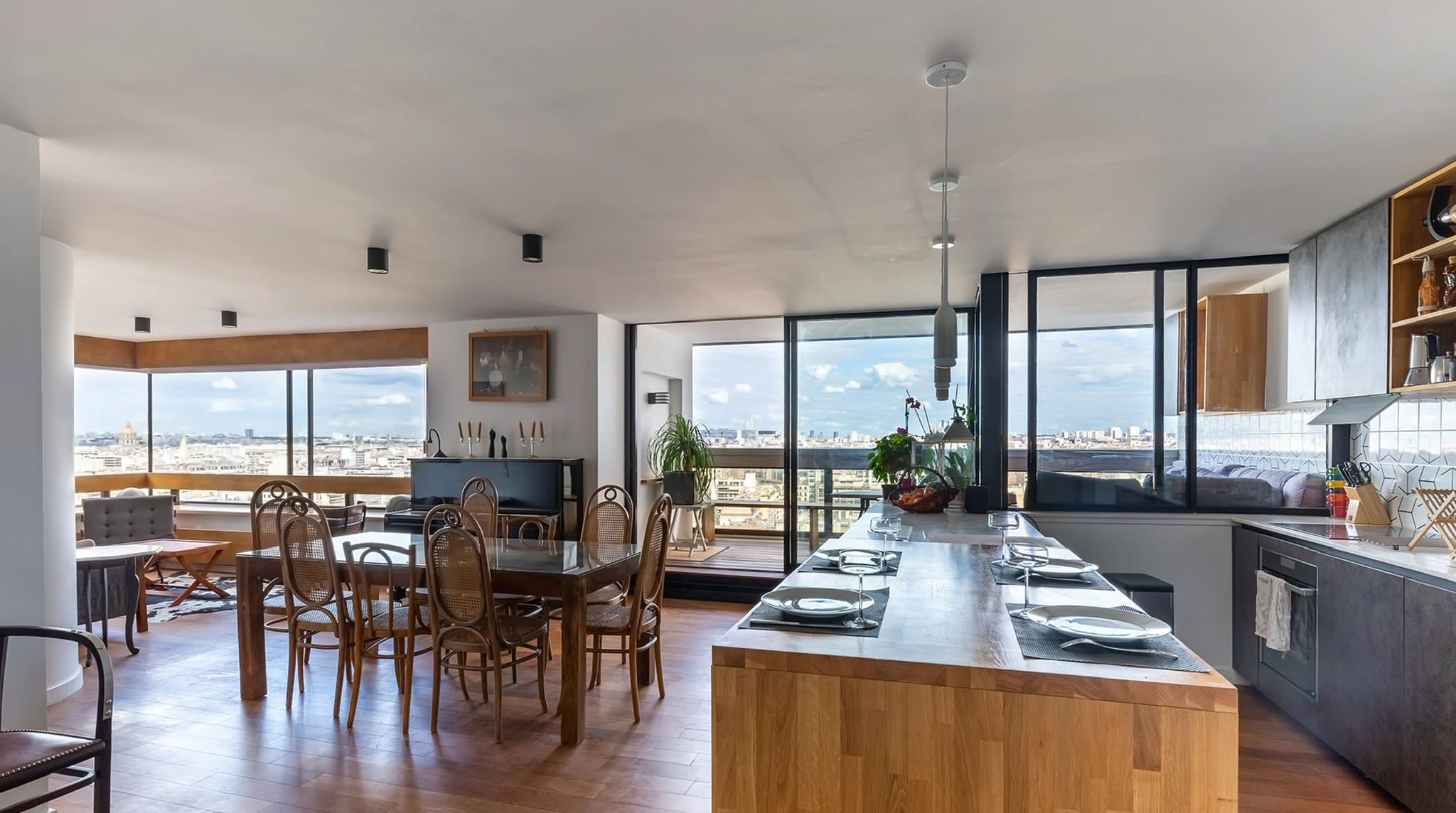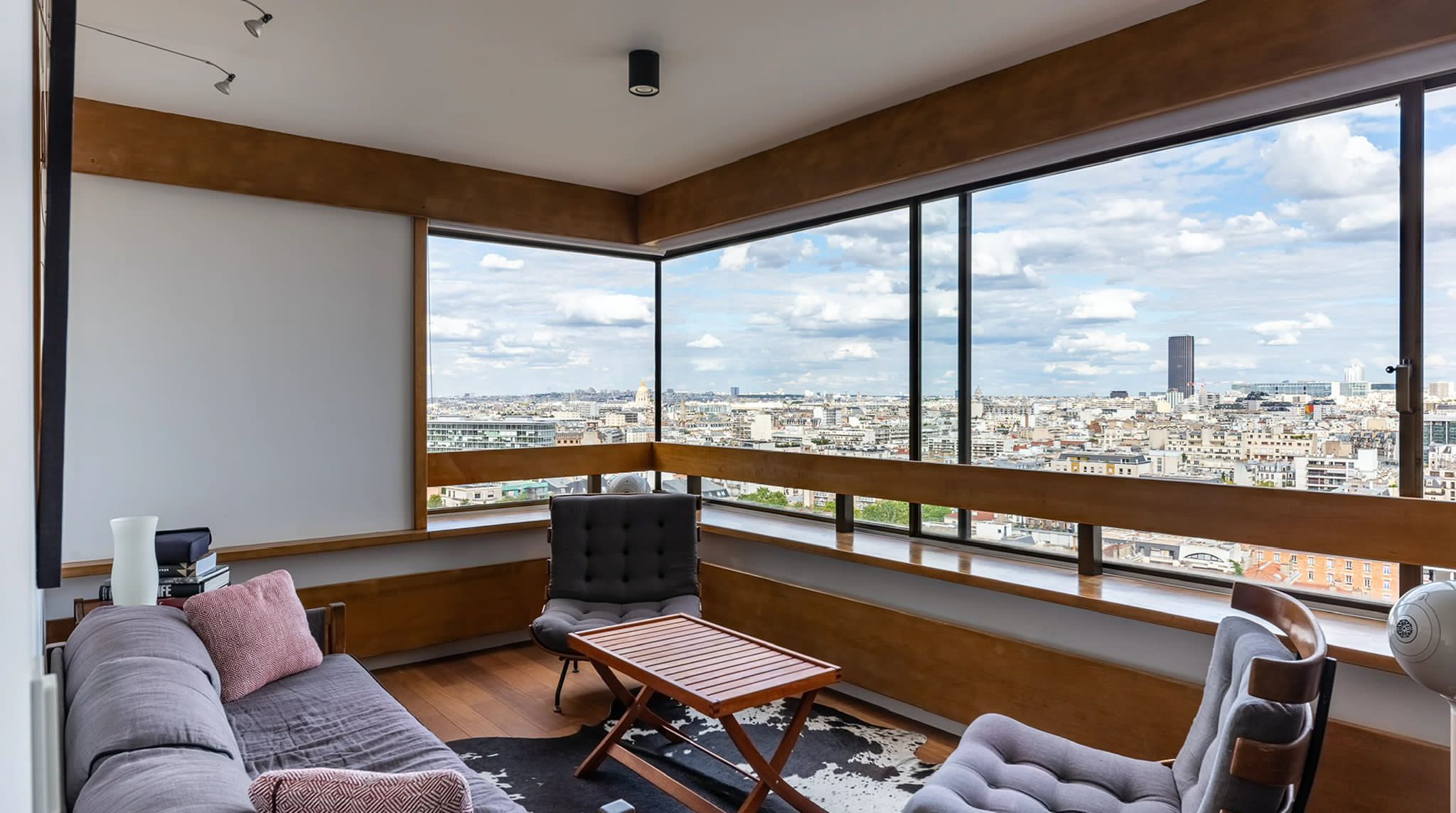L'appartement n'avait été que très peu touché depuis sa livraison originale. Le propriétaire souhaitait pouvoir organiser de belles réceptions intérieures/extérieures avec une cuisine ouverte sur la pièce de vie, autour du piano et d'une belle sono. La nuit, le salon se transforme en une salle de cinéma privée avec le projecteur dissimulé derrière la cloison de la chambre. Les salles-de-bain ont été intégralement refaites et un dressing a été créé afin de libérer l'espace sans compromettre le rangement. Aujourd'hui, dès le franchissement du seuil, la vue panoramique sur Paris s'ouvre au visiteur. Les courbes de l'appartement l'accompagnent dans sa découverte des espaces jusqu'à la terrasse à présent partie intégrante du cœur de la maison.
