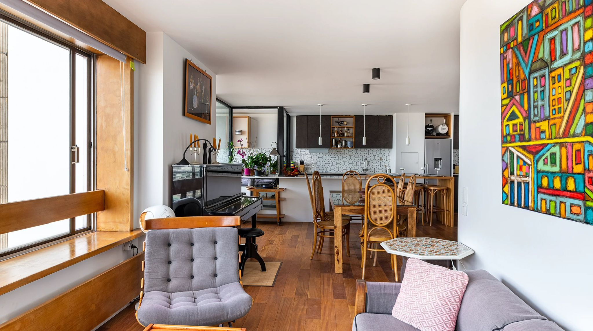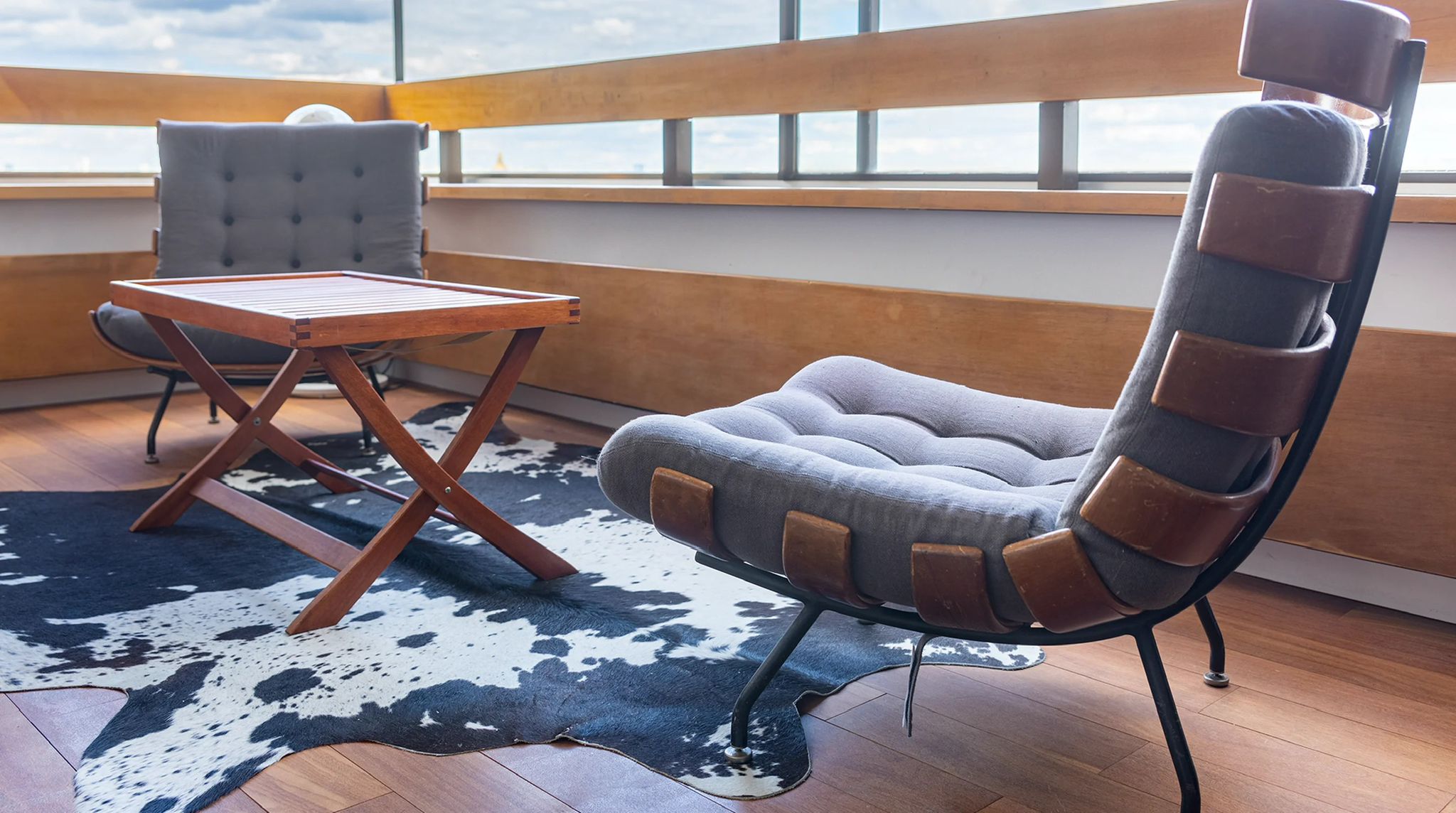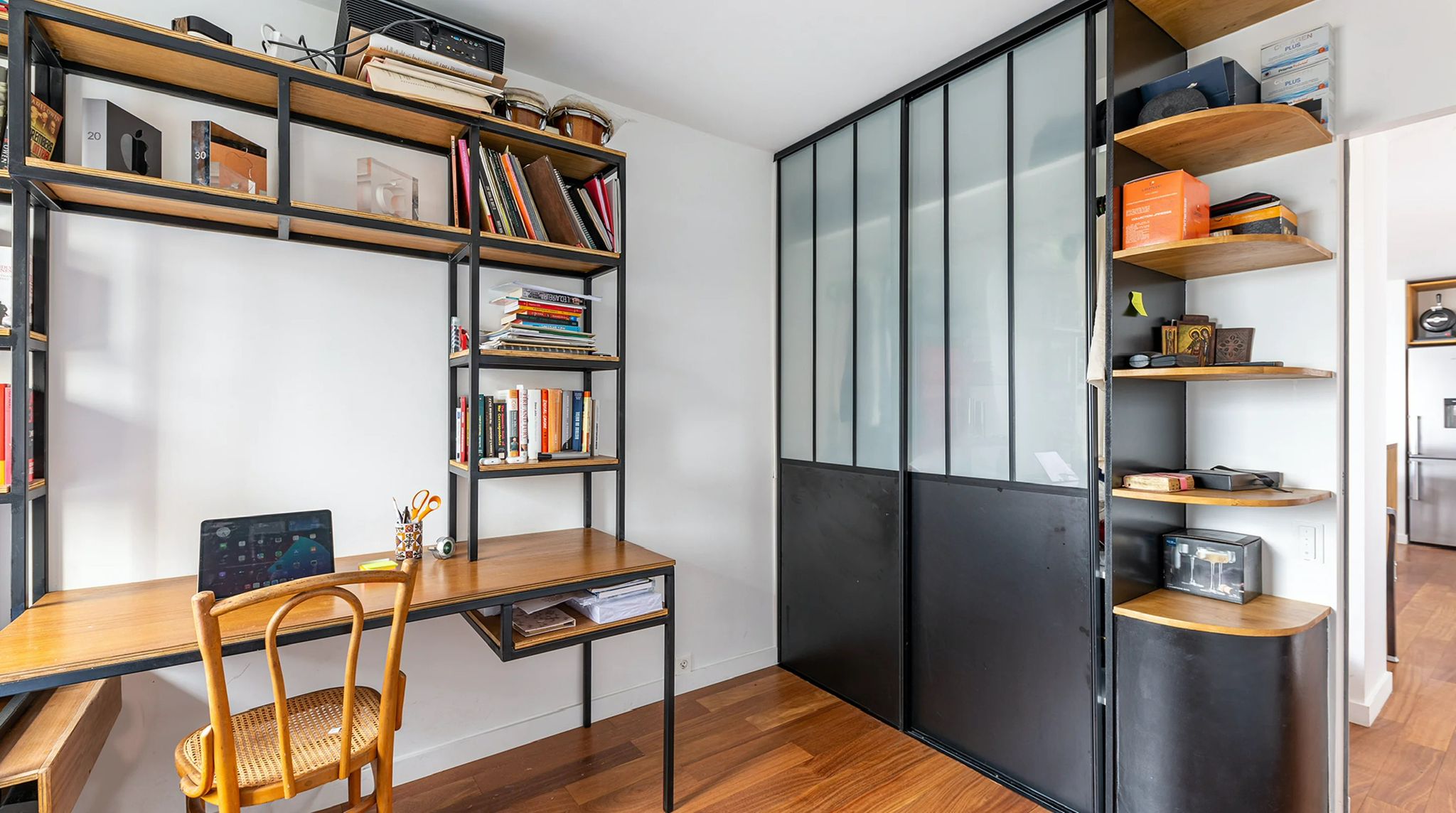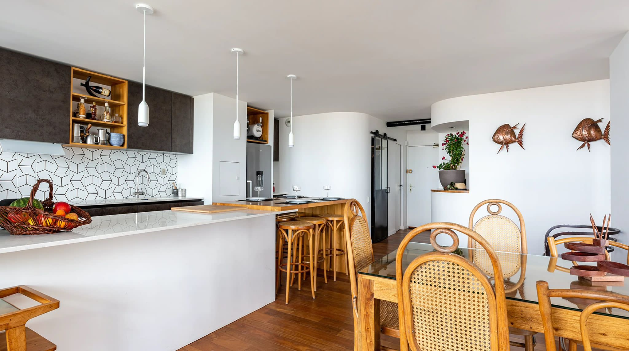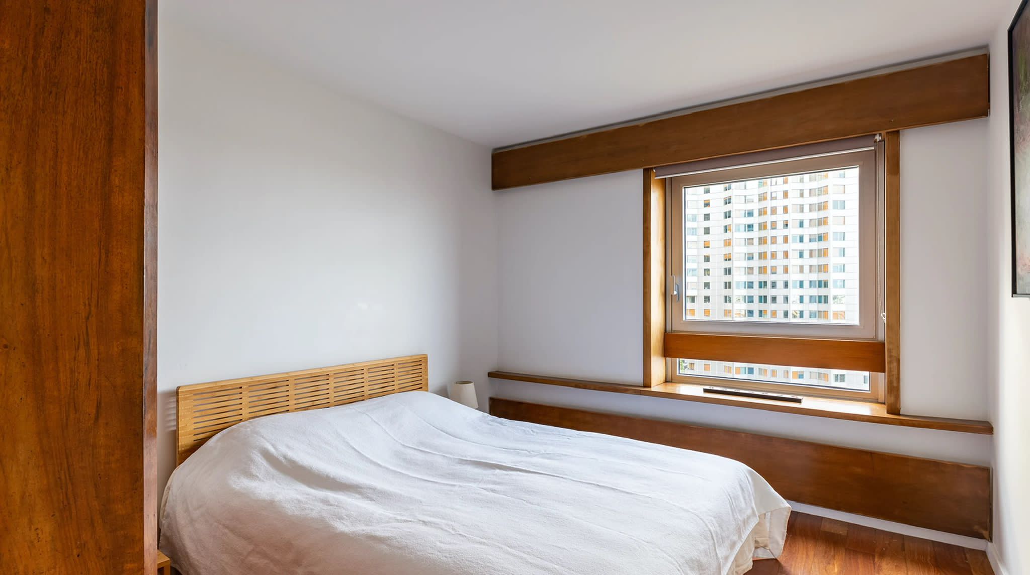 L'appartement n'avait été que très peu touché depuis sa livraison originale. Le propriétaire souhaitait pouvoir organiser de belles réceptions intérieures/extérieures avec une cuisine ouverte sur la pièce de vie, autour du piano et d'une belle sono. La nuit, le salon se transforme en une salle de cinéma privée avec le projecteur dissimulé derrière la cloison de la chambre. Les salles-de-bain ont été intégralement refaites et un dressing a été créé afin de libérer l'espace sans compromettre le rangement. Aujourd'hui, dès le franchissement du seuil, la vue panoramique sur Paris s'ouvre au visiteur. Les courbes de l'appartement l'accompagnent dans sa découverte des espaces jusqu'à la terrasse à présent partie intégrante du cœur de la maison.